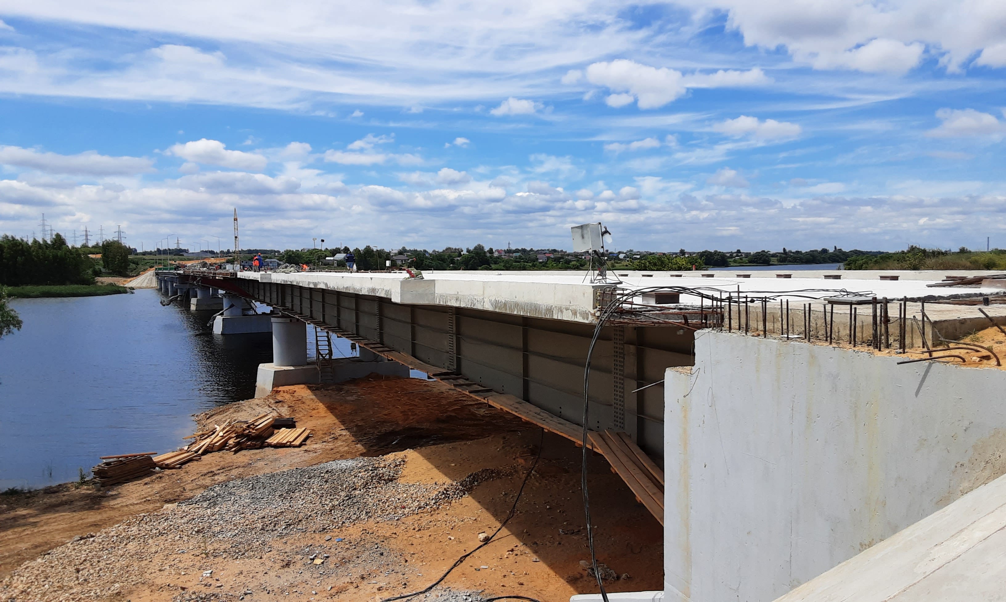Первая половина 365-метрового моста со стороны Казинки с железобетонными несущими конструкциями была построена в прошлом году. Сейчас на финишной прямой — возведение второй части сооружения с металлическими пролетными балками. Бетонные работы завершены. Специалисты занимаются гидроизоляцией монолитной плиты. Уже в июле подрядчик планирует здесь уложить асфальтобетонное покрытие. Параллельно начат монтаж конструкций перильного ограждения, системы водосбора. Работы ведутся под постоянным надзором строительного контроля.